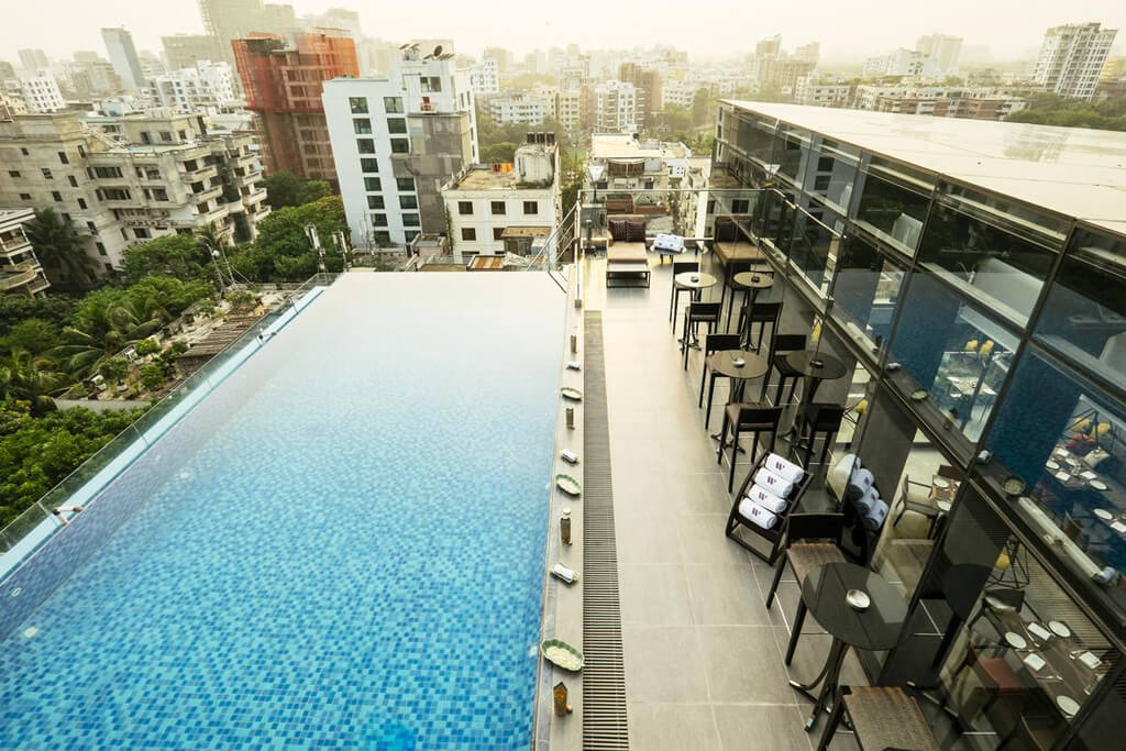 - Aqua Deck: Outdoor pool area with a dual infinity pool, built-in jacuzzi, and panoramic views of the Dhaka skyline.