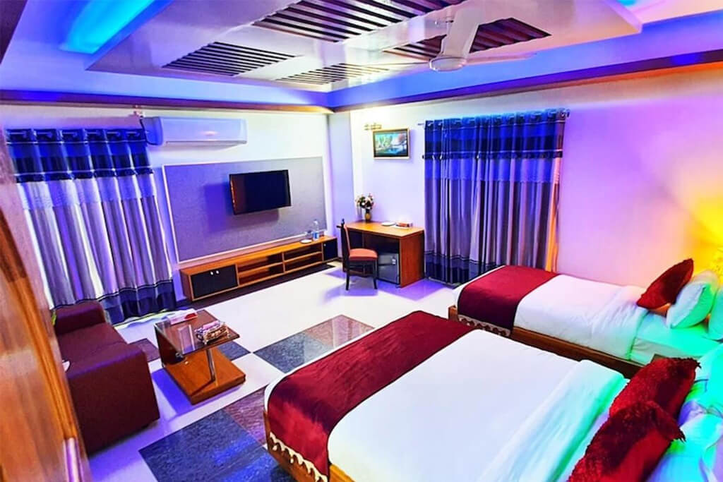 - Rooms: Options include Deluxe Couple, Deluxe Family, Deluxe Twin, Royal Deluxe Family, VIP Deluxe, and Executive Twin rooms. All are equipped with air conditioning, flat-screen TVs, and seating areas.