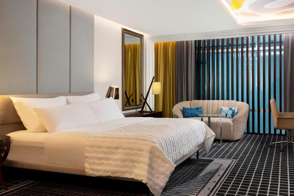 Unwind in our spacious hotel rooms and suites showcasing thoughtful details like complimentary Wi-Fi access, plush bedding, a flat-screen TV, a mini-bar, and a luxurious bathroom. Enjoy our 5-star hotel’s selection of six dining options, featuring a trattoria-style Italian restaurant and a chic lobby lounge. We also boast a tranquil spa and a breathtaking rooftop infinity pool.